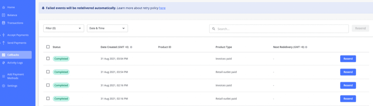 In case you need to receive again the payment link callback again, you can resend callback on Dashboard > Callbacks > Resend. You can also use the Search Bar to query transactions you want to resend callbacks for.