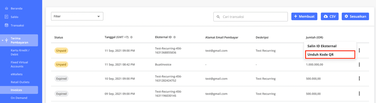 Apabila Anda ingin mengunduh kembali QR code, dapat Anda lakukan melalui Dasbor > Terima Pembayaran > Invoices > Unduh Kode QR:
