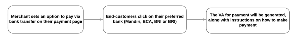 Pelanggan Anda dapat membayar ke Virtual Account Anda melalui ATM, mobile banking, dan internet banking. Namun, harap diperhatikan bahwa metode pembayaran berbeda tergantung bank pengirim.