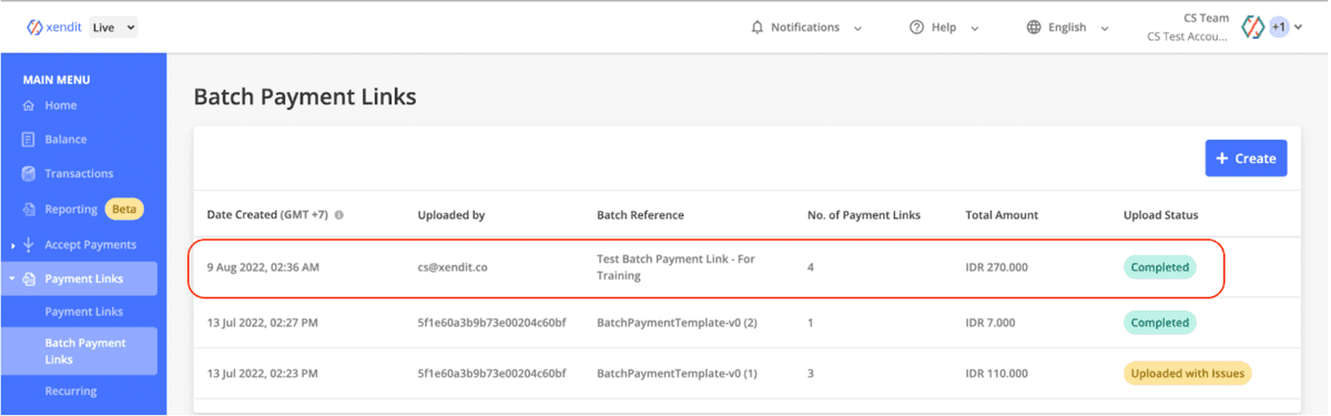 - If your upload is successful, you will be able to see the results on your Batch Payment Links page. Here is an example of the result: