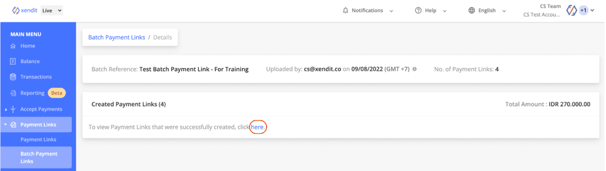After successfully generating the Batch Payment Links, you can click on each batch to view each individual payment link. Click the “here” button to go into more details.