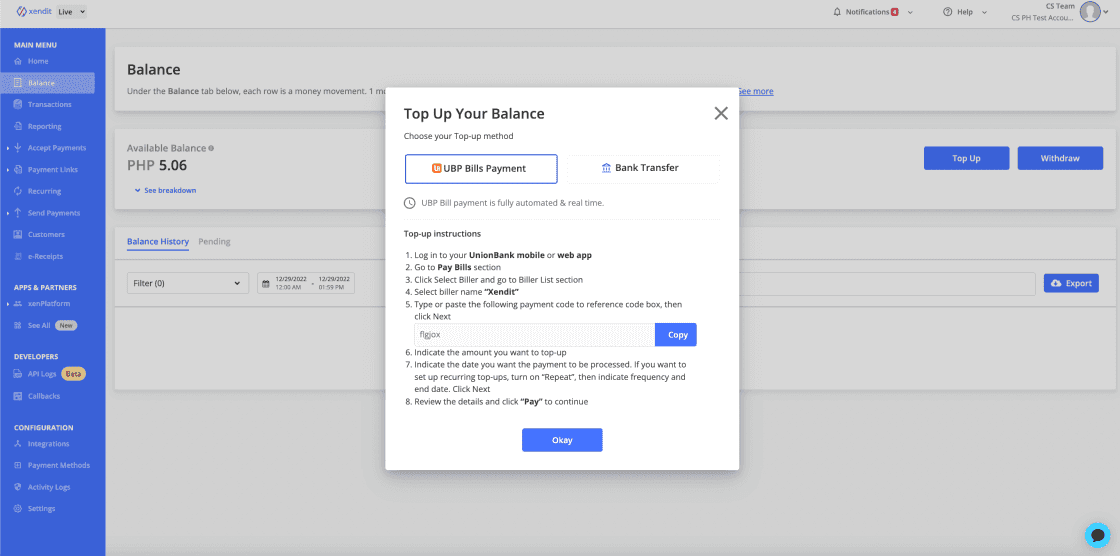 Your successful payment will automatically be detected as a top-up and will be credited to your Xendit Balance within five (5) minutes.